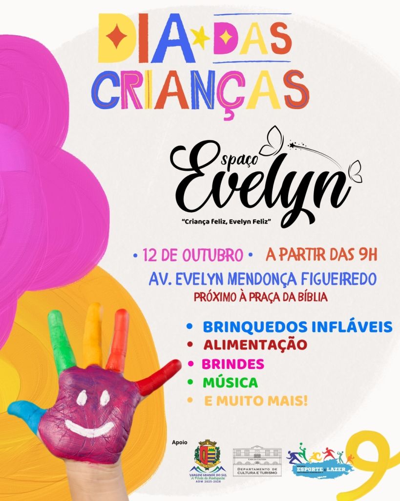 O Departamento de Cultura e Turismo convida toda a população para participar de mais uma edição do Espaço Evelyn, que acontece no dia 12 de outubro, em comemoração ao Dia das Crianças na Avenida Evelyn Mendonça de Figueiredo próximo a Praça da Bíblia, às