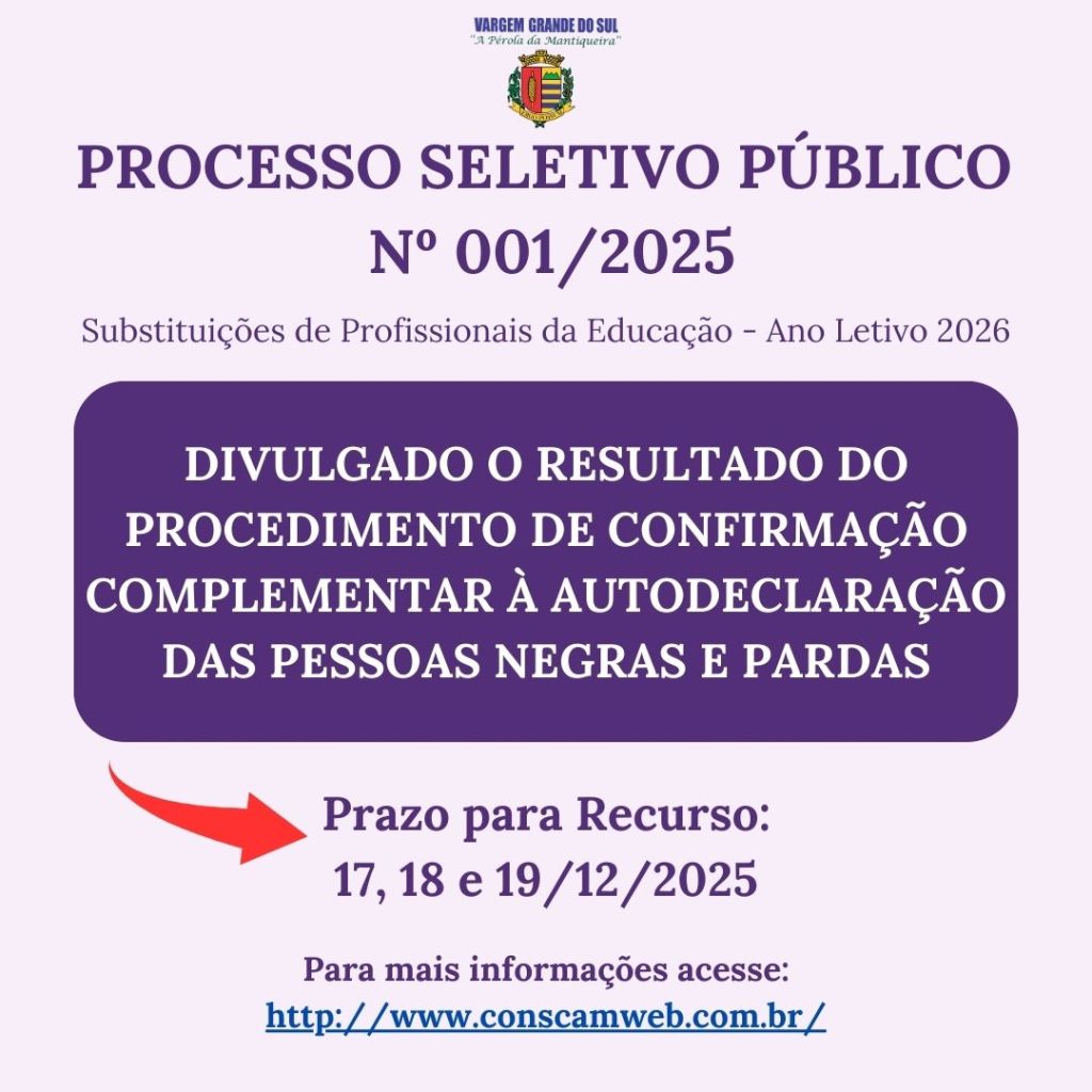Os candidatos que tiverem intenção de interpor recurso, tem o prazo de 17, 18 e 19 de dezembro de 2025, para fazê-lo conforme orientações editalícias.