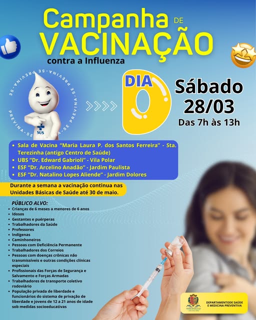 O Departamento de Saúde e Medicina Preventiva da Prefeitura informa que, neste sábado, dia 28 de março, acontecerá o Dia D da campanha de vacinação contra a gripe (Influenza), com atendimento das 7h às 13h, nas seguintes unidades de saúde: