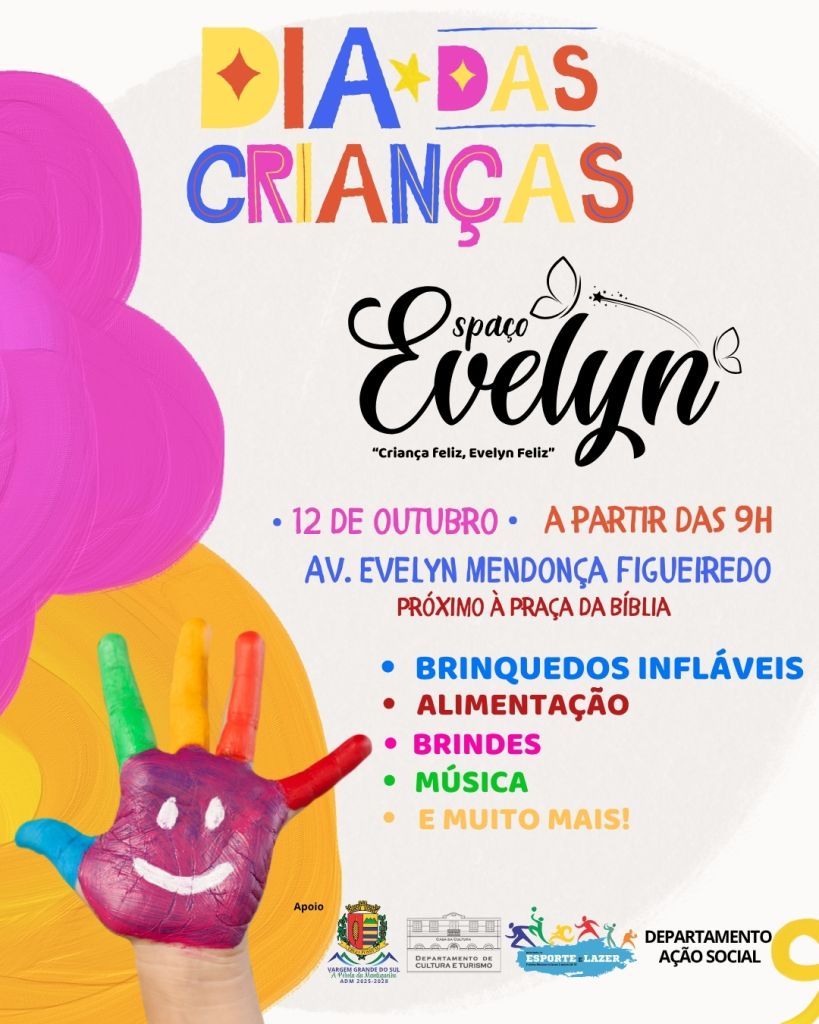 O Departamento de Cultura e Turismo convida toda a população para participar de mais uma edição do Espaço Evelyn, que acontece no dia 12 de outubro, em comemoração ao Dia das Crianças na Avenida Evelyn Mendonça de Figueiredo próximo a Praça da Bíblia, às