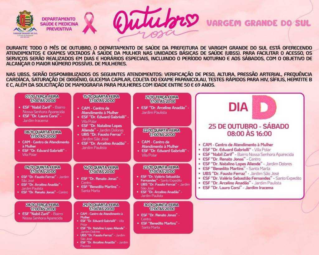 Durante todo o mês de outubro, o Departamento de Saúde e Medicina Preventiva da Prefeitura Municipal está promovendo a campanha “Outubro Rosa”, com atendimentos em horários estendidos, incluindo noites e sábados, para alcançar o maior número possível de m
