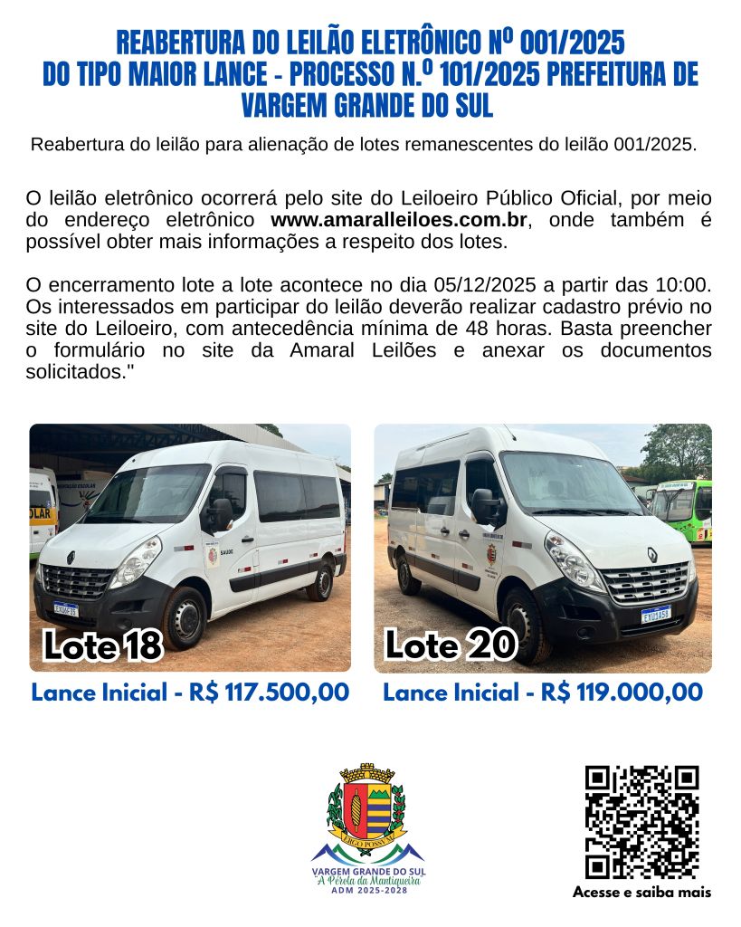 REABERTURA DO LEILÃO ELETRÔNICO Nº 001/2025 DO TIPO MAIOR LANCE - PROCESSO N.º 101/2025 PREFEITURA DE VARGEM GRANDE DO SUL