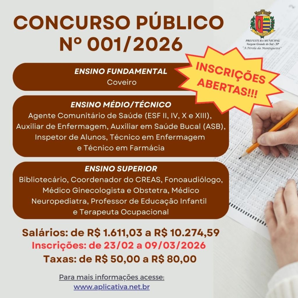 A partir de hoje (23/02/2026), estão abertas as inscrições para o Concurso Público nº 001/2026 da Prefeitura Municipal de Vargem Grande do Sul/SP, destinado ao provimento de diversos cargos públicos efetivos.