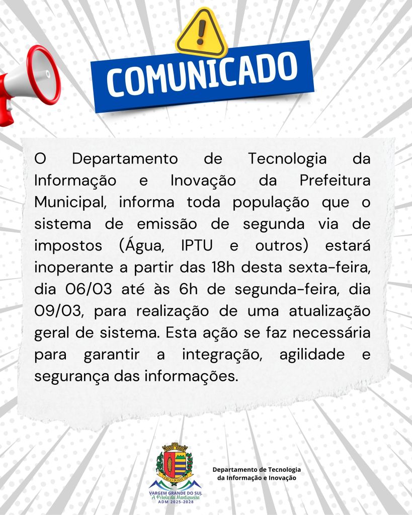 O Departamento de Tecnologia da Informação e Inovação da Prefeitura Municipal, informa toda população que o sistema de emissão de segunda via de impostos (Água, IPTU e outros) estará inoperante a partir das 18h desta sexta-feira, dia 06/03 até às 6h de segunda-feira, dia 09/03, para realização de uma atualização geral de sistema. Esta ação se faz necessária para garantir a integração, agilidade e segurança das informações.