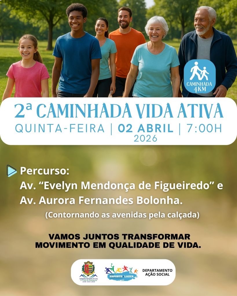 O Departamento de Esportes e Lazer, em parceria com o Departamento de Ação Social da Prefeitura Municipal, convida toda a população para participar da 2ª Caminhada Vida Ativa, que será realizada nesta quinta-feira, dia 02 de abril de 2026, a partir das 7h.